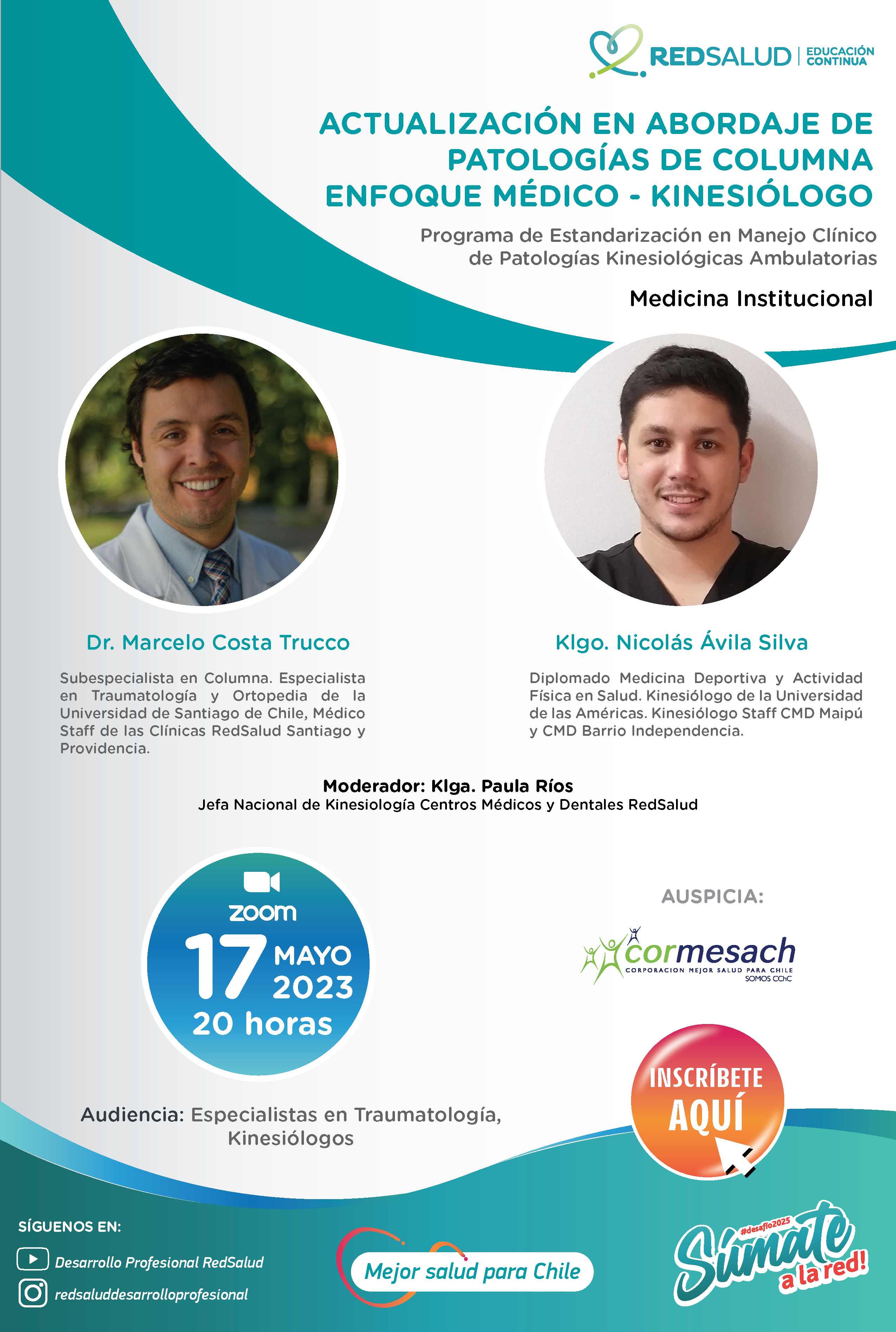 | Temas: | Actualización en abordaje de patologías de columna. Enfoque médico - kinesiólogo | |